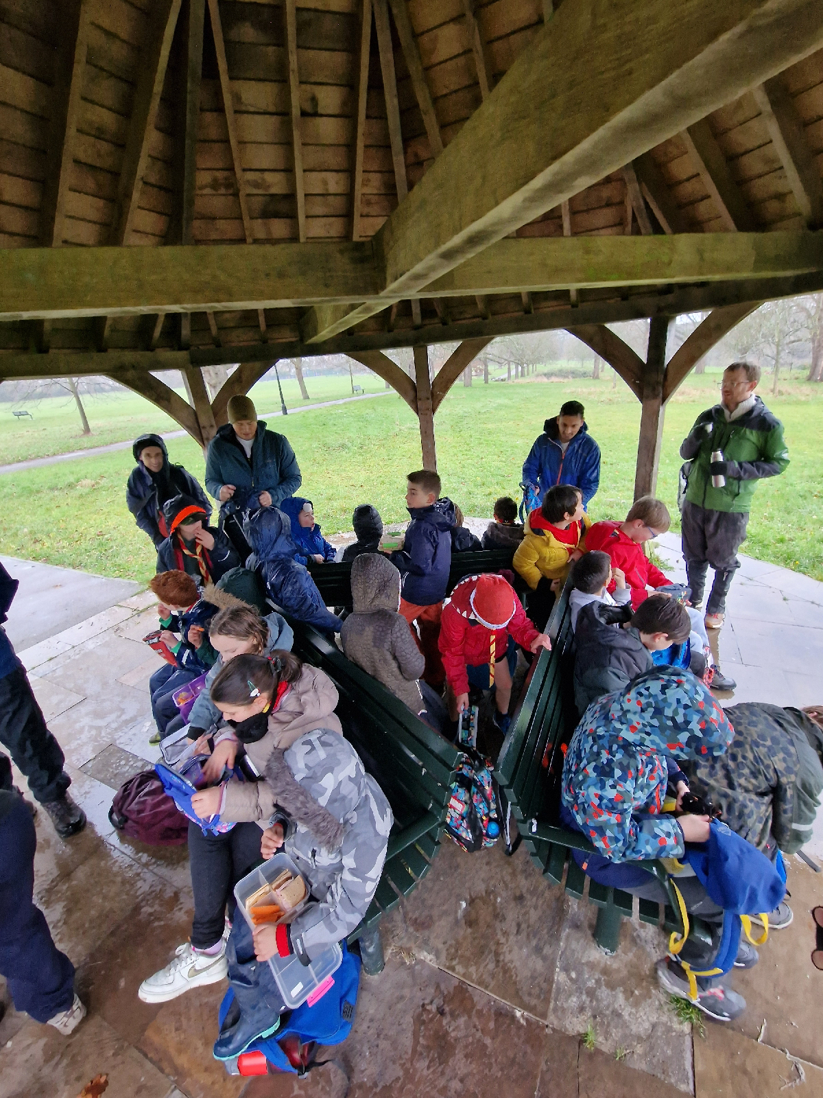 Lunch and hot chocolate while sheltering from the rain in the bandstand at Churchfields Recreation Ground